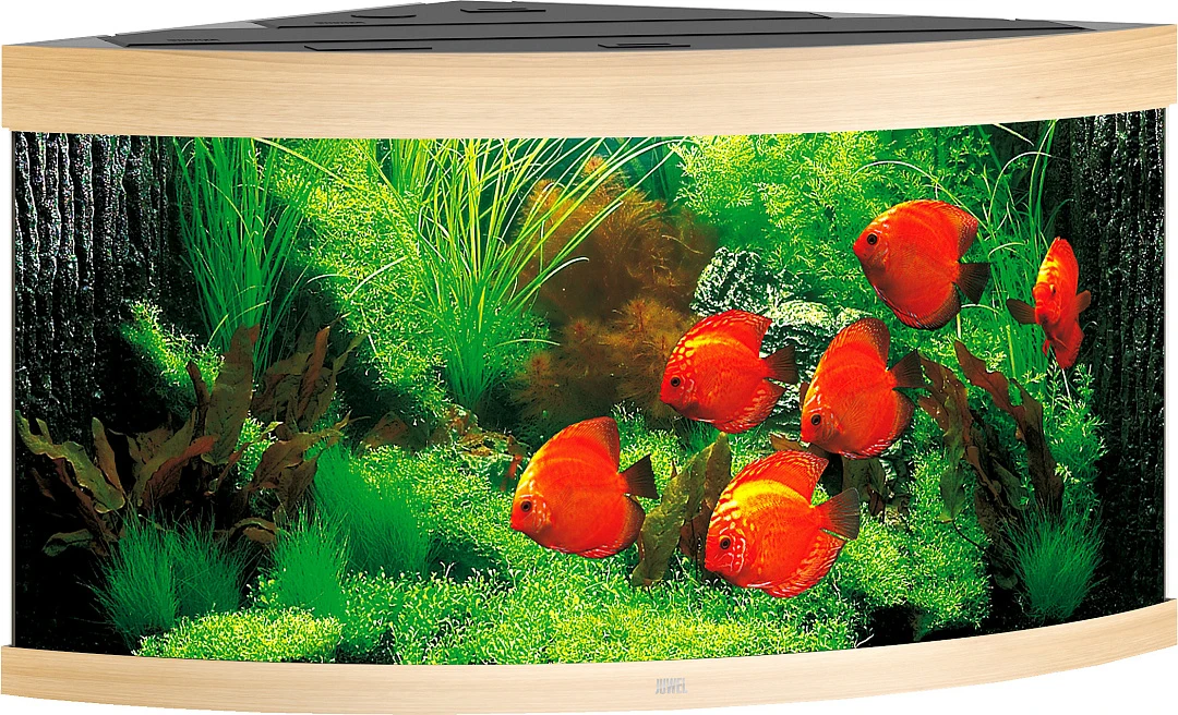 Prachtig hoekaquarium met indrukwekkende dieptewerking. Incl. filter, verlichting en verwarmingselement. Afm. 123 x 87 x 65 cm. Exclusief meubel.